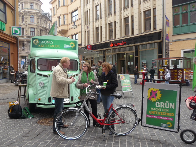 Bei der Eröffnung des Kaffeemobils in Halle mit Steffi Lemke sprachen wir direkt mit den Menschen vor Ort. Mit fair gehandeltem Bio-Kaffee wärmten wir die Menschen während ihrer Spaziergänge durch die Stadt auf.