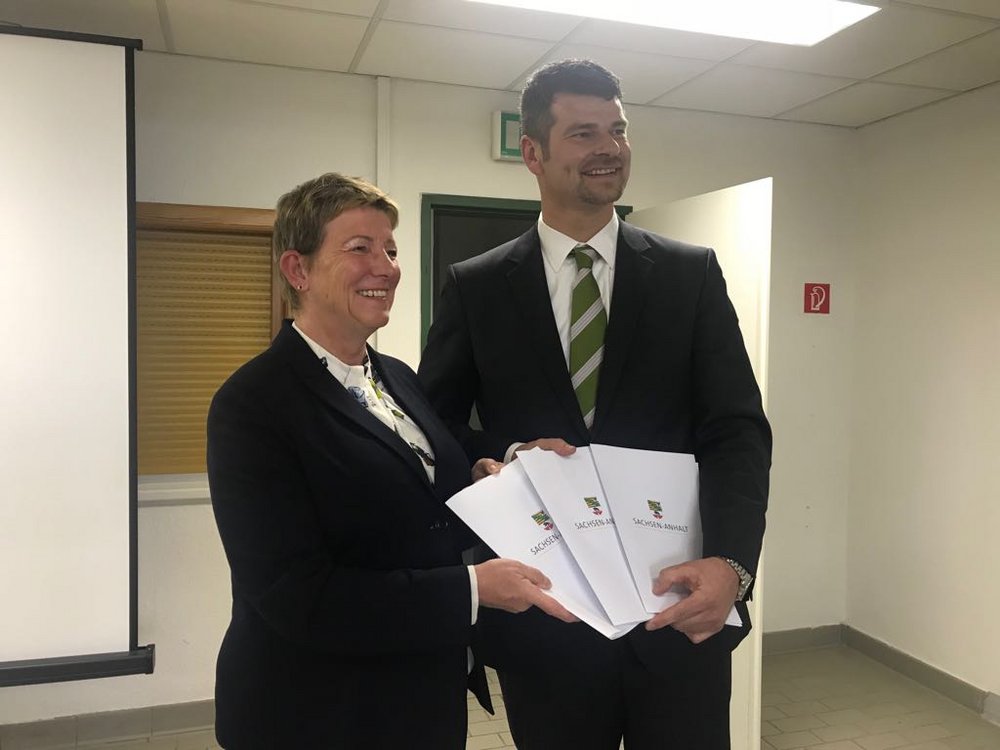 Umweltministerin Claudia Dalbert in Petersberg Zuwendungsbescheide an den Wasser- und Abwasserzweckverband Saalkreis übergeben. Damit wurde Grünes Licht für Investionen in Höhe von insgesamt 6,5 Millionen Euro in neue Abwasserkanäle gebeten. Durch die Förderung soll die Gewässerqualität verbessert werden.