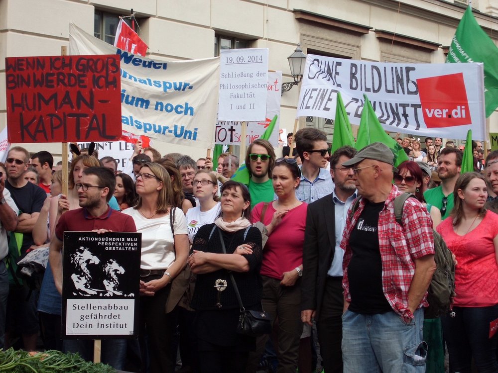 Bei der Demonstration gegen die Kürzungen der Landesregierung im Hochschul- und Wissenschaftsbereich haben sich am 15. Mai auf dem Uniplatz in Halle (Saale) die Abgeordneten Prof. Dr. Claudia Dalbert und Sebastian Striegel, Grüne Jugend, Grüne Hochschulgruppe, Stadtverband, Landesverband zusammen für die Zukunft der Hochschulen in Sachsen-Anhalt eingesetzt.