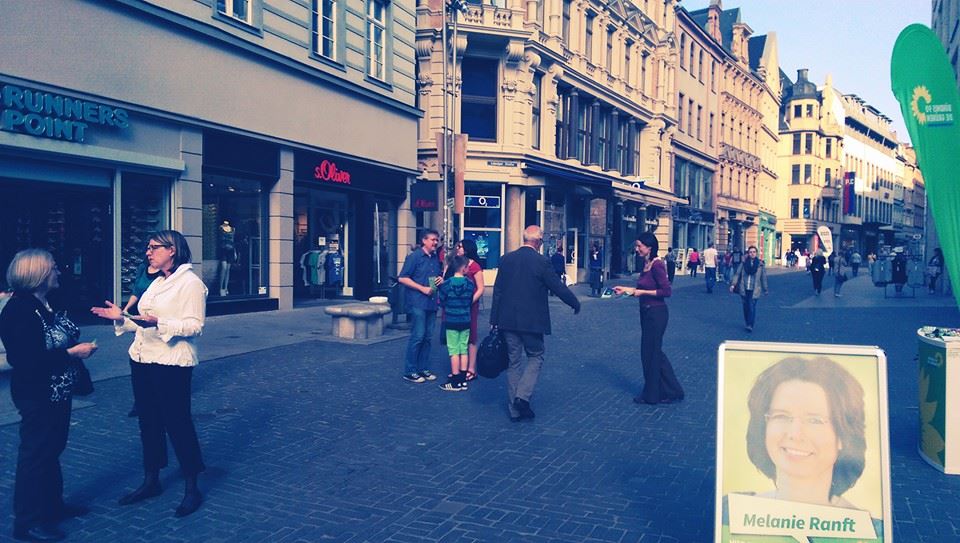 Claudia Dalbert war gestern zusammen den StadtratskandidatInnen Melanie Ranft und Sebastian Kranich vom Stadtverband Halle (Saale) im Wahlkampfeinsatz. Beim Verteilen der Flyer fanden sich auf viele Gelegenheiten zu Gesprächen über Grüne Ideen für die Stadt und Europa. Am Dienstag Abend nimmt sie am Wahlkampfhöhepunkt, ab 18 Uhr auf dem Sonnendeck teil.