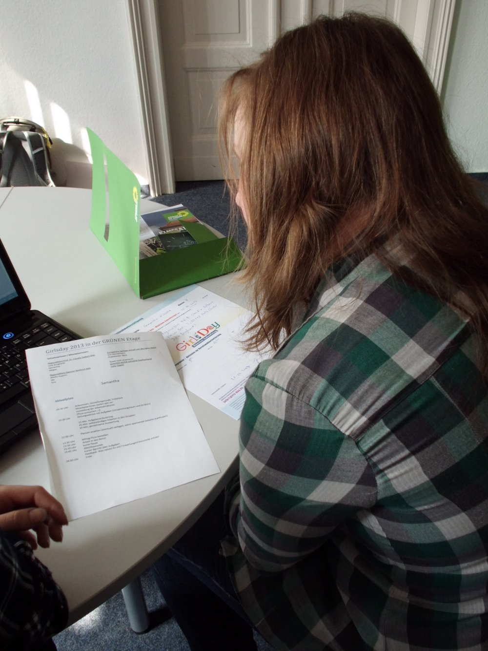Donnerstag, der 25.04.2013 – eigentlich ein normaler Tag, wie jeder andere, aber anstatt in die Schule zu gehen, versammelten wir uns in der GRÜNEN Etage um dort unseren Girls' Day zu verbringen. Als Allererstes stellten sich uns die freundlichen Mitarbeiter vor und nahmen uns die ersten Ängste bei einer Tasse Tee und einem Stück frisch gebackenem Käsekuchen – voll lecker! Nach ersten Einweisungen in die Vielfalt der Berufsfelder und die verschiedensten Aufgaben einer Partei, beschäftigten wir uns in zwei Gruppen mit unseren zu meisternden Herausforderungen.