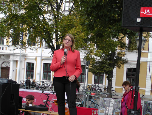 Die Fraktionsvorsitzende von BÜNDNIS 90/DIE GRÜNEN, Dr. Claudia Dalbert, und die kinder- und jugendpolitische Sprecherin der Fraktion, Cornelia Lüddemann, sprachen mit den Demonstranten.
