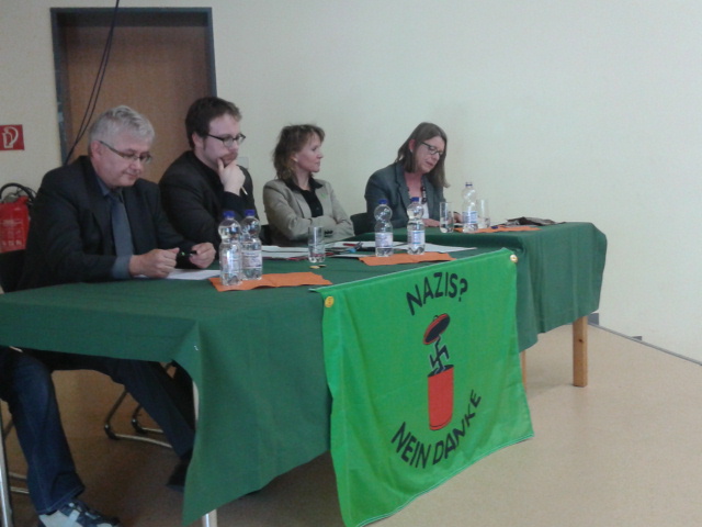 Über die zahlreichen Möglichkeiten der Handlungsansätze in der Auseinandersetzung mit Neonazis diskutierte die Podiumsdiskussion in Sangerhausen. Claudia Dalbert forderte systematische Angebote für Lehrerinnen um Lehrer um über die vielen guten Einzelprojekte hinaus mehr Demokratieerziehung in die Schule zu bringen. Zähes Ringen auch zwischen dem Oberbürgermeister Ralf Poschmann und der Bundesgeschäftsführerin Steffi Lemke was Bündnisse gegen Rechtsextremismus erreichen können, sollen und vor allem wollen. Fazit von Claudia Dalbert für den weiteren Einsatz gegen Rechtsextremismus am Ende der sehr guten aber auch kontroversen Diskussion: "Wir haben viele Hinweise darauf, dass das was wir tun nicht ausreicht. Es kommt nicht drauf an viel zu tun, sondern es kommt darauf an jetzt das Richtige zu tun."