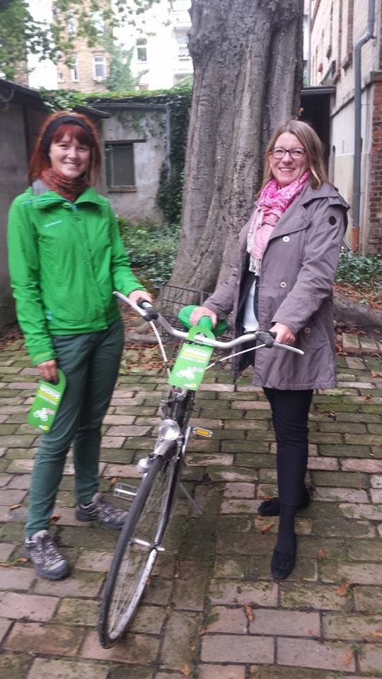 Claudia Dalbert hat heute sehr gern Ann-Sophie Bohm-Eisenbrandt, Mitglied des Stadtvorstands BÜNDNIS 90/DIE GRÜNEN Halle (Saale), ihr Fahrrdad übergeben. Sie unterstützt somit die Aktion "Werde Radgeber". Bis zum 19. September können noch Fahrräder für Flüchtlinge beim Stadtverband oder im Postkult abgegeben werden, damit diese dann am 19. September gemeinsam repasiert werden können. So möchte man die Mobilität von Flüchtlingen in Halle unterstützen. Eine tolle Aktion!
