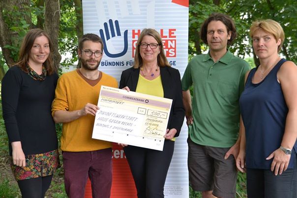 Am Freitag übergaben Claudia Dalbert und Sebastian Striegel in Halle einen Scheck über 500 Euro an das "Bündnis gegen Rechts - Halle für Zivilcourage" aus dem Aktionsfonds der Landtagsabgeordneten von BÜNDNIS 90/DIE GRÜNEN. Mit der Spende will das Bündnis in einer Zukunfstwerkstatt mit fachlich-methodischer Begleitung seine bisherige Arbeit auswerten und verbessern. Auch möchte es Bündnismitglieder aktivieren, neue Engagierte hinzugewinnen und neue Arbeitsstrukuturen entwickeln. http://www.halle-gegen-rechts.de/