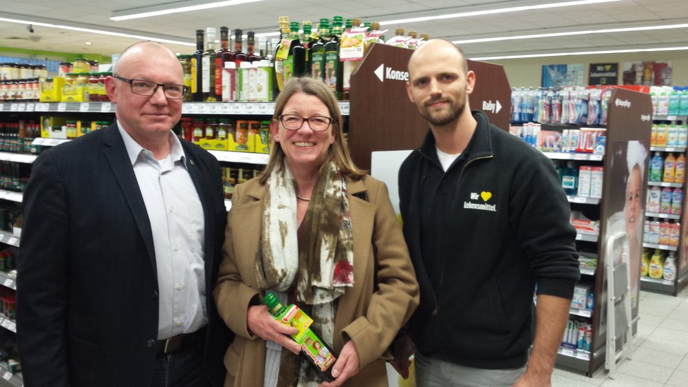 Geschäftsstellenleiter Herr Moex und Inhaber Herr Eckert freuten sich über den Besuch von Claudia Dalbert. Was sind die alltäglichen Probleme im Lebensmittelhandel, wenn sowohl Öko-Produkte als auch regionale Produkte im Sortiment zentral sind.
