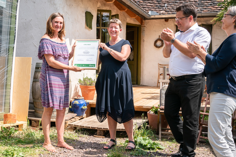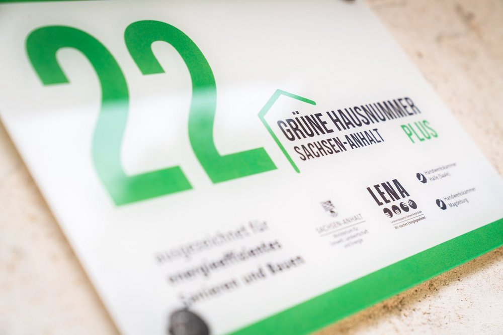 Ministerin Prof. Dr. Claudia Dalbert hat die „Grüne Hausnummer Sachsen-Anhalt PLUS“ an Familie Weingärtner aus Magdeburg übergeben. Deren Strohballenhaus, das nach Passivhausstandard, gebaut wurde, konnte die Jury überzeugen. „Ich freue mich, Familie Weingärtner die Grüne Hausnummer überreichen zu dürfen. Mit ihrem energieeffizienten Haus senken sie ihren Energieverbrauch und schützen dadurch gleichzeitig das Klima. Das ist fantastisch, denn was gut für das Klima ist, ist auch gut für den eigenen Geldbeutel", sagte die Ministerin.