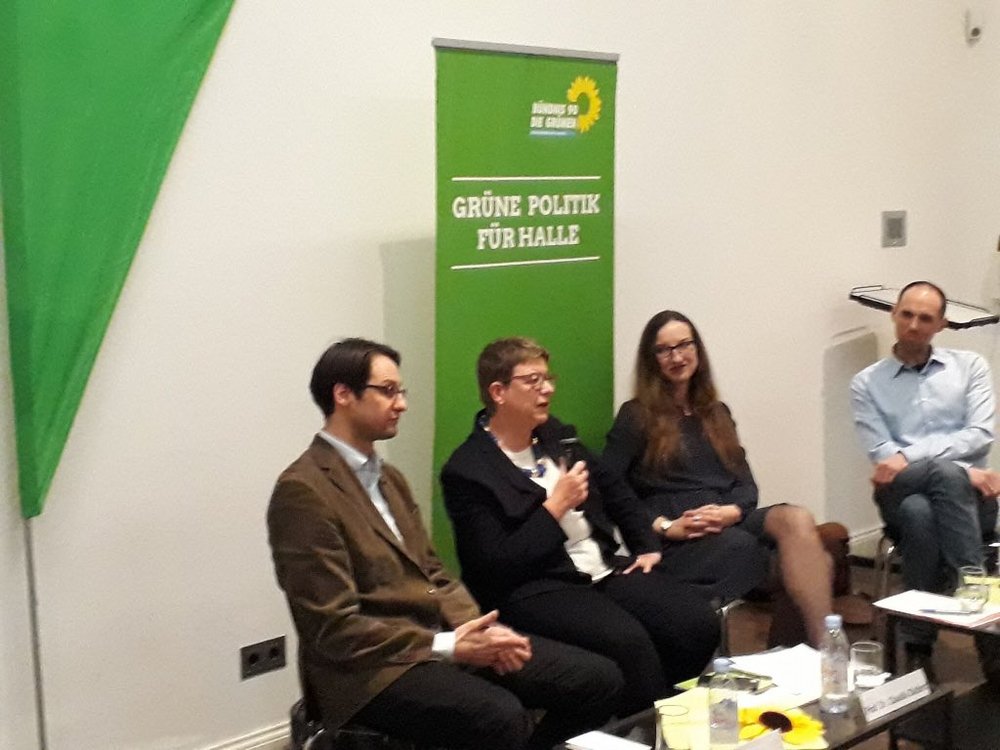 Gedränge bei der Veranstaltung des BÜNDNIS 90/DIE GRÜNEN Stadtverbands in Halle im Landesmuseum für Vorgeschichte am 7. März 2018 zum Thema „Die menschengemachte Klimakrise der Gegenwart und natürliche Klimaveränderungen in der Erdgeschichte – Wissenschaftliche Erkenntnisse in der politischen Diskussion.“ Mit der aktuellen Sonderausstellung zur Klimageschichte anhand archäologischer Funde aus Mitteldeutschland zeigte das Landesmuseum für Vorgeschichte wieder einmal, wie archäologisches Wissen einem breiten Publikum vermittelt werden kann. Der Titel der Ausstellung „Klimagewalten“ und das Thema erregen auch deswegen Aufmerksamkeit, weil Ursachen und Folgen der aktuellen Erderwärmung als menschengemachtes Phänomen in der politischen Diskussion immer wieder in Frage gestellt werden – nicht zuletzt unter Verweis auf natürliche Klimaveränderungen in der Erdgeschichte. Über Jahrtausende wirkende Klimagewalten und eine menschengemachte Klimakrise. Was müssen wir tun, um unsere Lebensgrundlagen zu erhalten? Eine spannende Debatte unter anderem mit Umweltministerin Prof. Dr. Claudia Dalbert (Ministerin für Umwelt, Landwirtschaft und Energie des Landes Sachsen-Anhalts), Dr. Andreas Marx (Mitteldeutsches Klimabüro, Helmholtz-Zentrum für Umweltforschung UFZ) und Dr. Frank Steinheimer (Zentralmagazin Naturwissenschaftlicher Sammlungen, Martin-Luther-Universität Halle-Wittenberg).