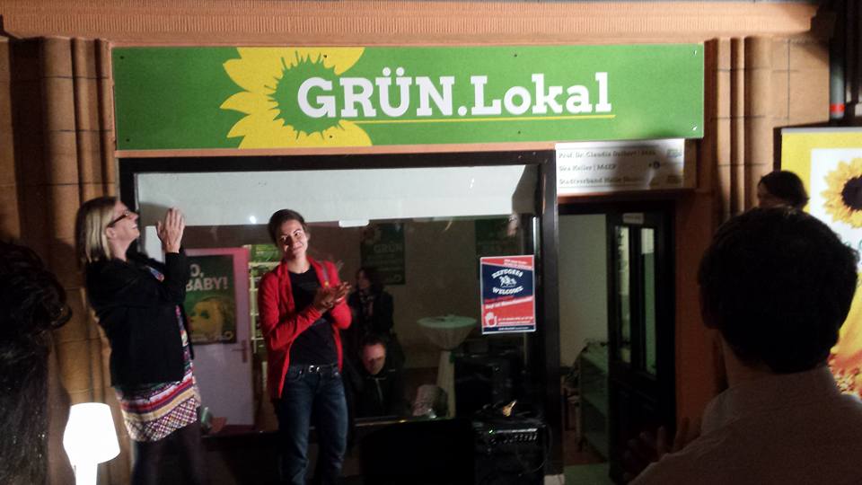 Mit einer rauschenden Party eröffneten die drei Mieterinnen der grünen Bürogemeinschaft das GRÜN.Lokal. Ska Keller (MdEP), Claudia Dalbert (MdL) und die Stadtvorsitzende Grit Michelmann lüftetetn gemeinsam das frisch aufgehängte Büroschild.