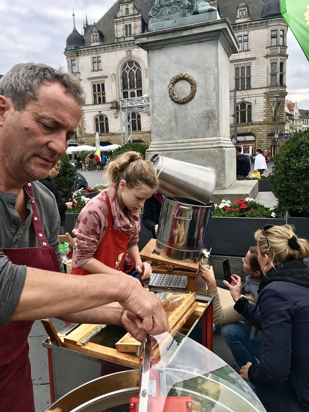 Zusammen mit Steffi Lemke, Spitzenkandidatin von BÜNDNIS 90/DIE GRÜNEN zur Bundestagswahl hat Umweltministerin Claudia Dalbert auf dem halleschen Marktplatz an einer Honigschleuderaktion teilgenommen. Imker Max und die Imkerkindergruppe schleuderten Honig und informierten die Passant*innen.