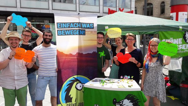 Bei der Grünen Jugend, die einen Klimaparcour anlässlich des Umwelttag auf dem halleschen Marktplatz aufgebaut hatte, ließ es sich Claudia Dalbert nicht nehmen, vorbei zu schauen.