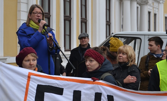 Vor dem Beginn des heutigen Plenartages versammeln sich vor dem Magdeburger Landtag Kulturschaffende, Studierende und Unterstützer. Gemeinsam demonstrieren sie gegen die angekündigten Kürzungen im Kultur- und Bildungsbereich. Auch die Vorsitzende der Landtagsfraktion von BÜNDNIS 90/DIE GRÜNEN, Dr. Claudia Dalbert (am Mikrofon), und die bündnisgrüne Abgeordnete Cornelia Lüddemann (2.v.r.) sind auf dem Domplatz mit dabei. Dalbert: „Heute erleben wir einen Tiefpunkt dieser Landesregierung. Alle bewegen sich, aber die Landesregierung mauert sich in ihren Kürzungsbeschlüssen ein.“