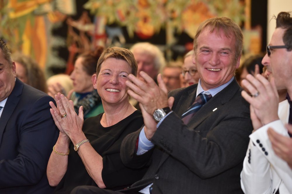 Umweltministerin Claudia Dalbert nahm an der Vernissage der Ausstellung "Gewebte Träume" teil. Dalbert bezeichnete die von Direktor Thomas Bauer-Friedrich eröffnete Ausstellung als "eine wunderbare Wiederentdeckung ostdeutscher Tapisserie".