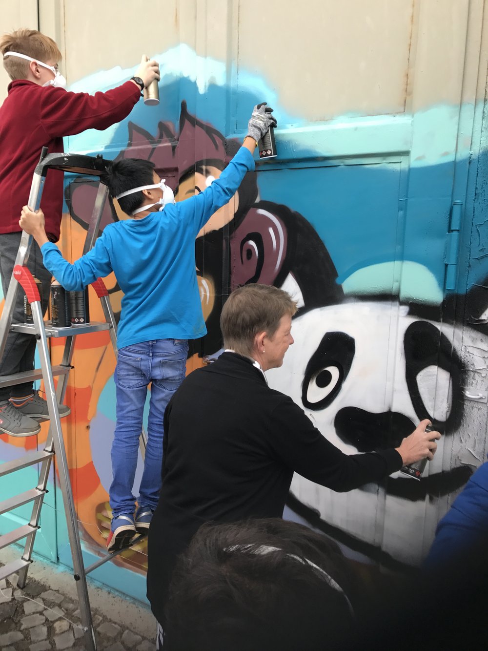 Umweltministerin Claudia Dalbert sprayte zusammen mit Schüler*innen der Graffiti AG der Sekundarschule „Friedrich-Ludwig-Jahn“ in Freyburg ein Grafitto an eine Fassade des Landesverwaltungsamts in Halle. Claudia Dalbert wollte durch das Besprühen auf den Wettbewerb "Aktion 2000 ist überall" aufmerksam machen. Für die 2. Auflage des Grafitti-Wettbewerbs wurden insgesamt 79 Entwürfe von Schüler*innen aus Sachsen-Anhalt eingereicht worden, die nun im Landesverwaltungsamt ausgestellt sind.