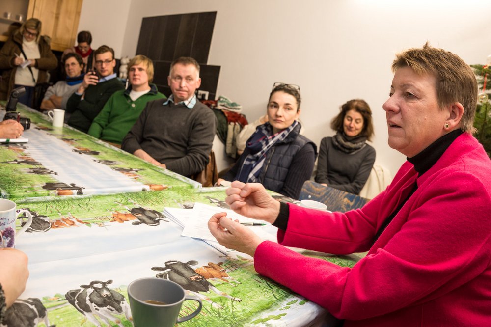 Landwirtschaftministerin Claudia Dalbert hat auf dem Hof von Familie Becker in Wiepke einen Junglandwirt*innenstammtisch besucht. Dabei tauschen sich die Teilnehmer*innen intensiv zu ökologischer Landwirtschat, politischer Verlässigkeit, Image und regionaler Vermarktung aus.