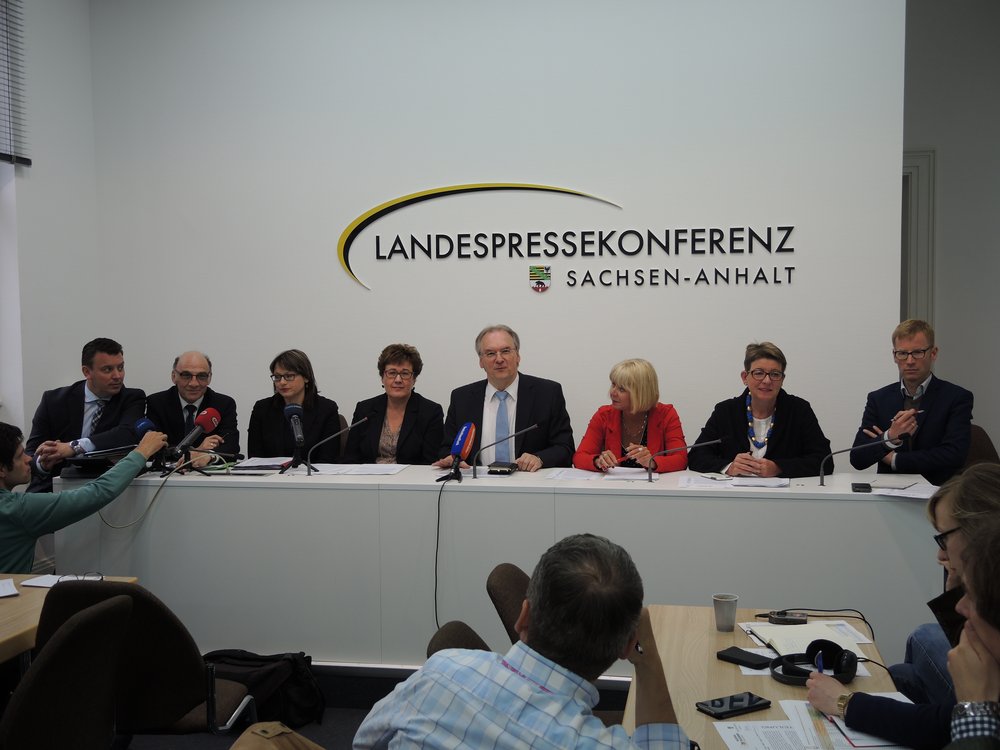 Ein Eindruck einer Landespressekonferenz, wenn alle Parteien am Tisch sitzen.