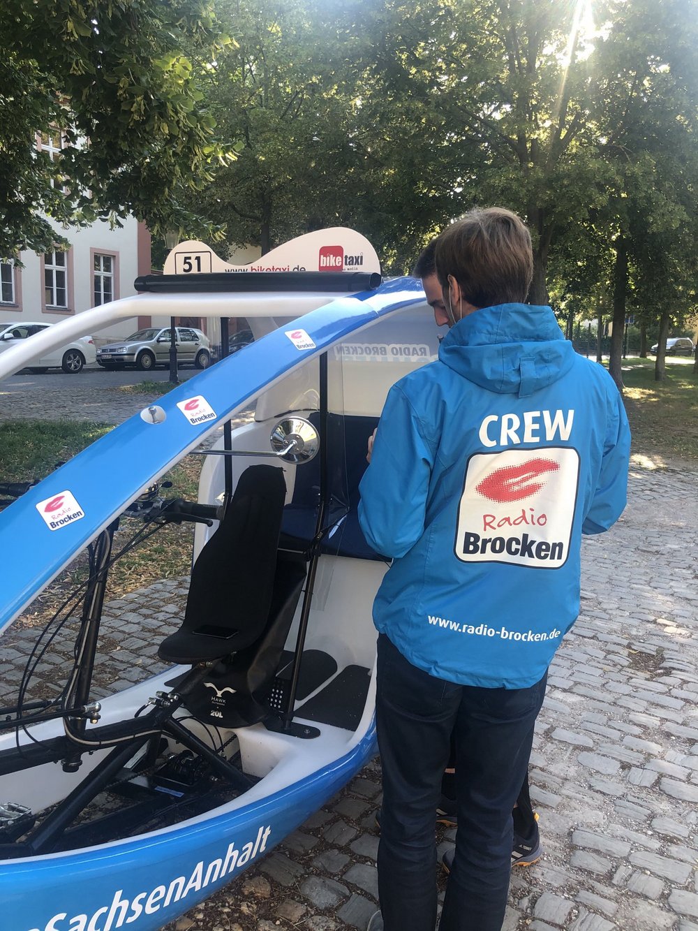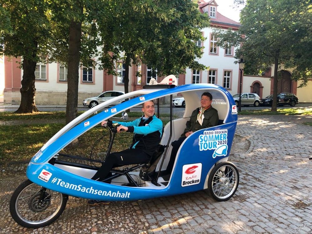 Radio Brocken Sachsen-Anhalt Reporter Dennis Schubert fährt zur Sommertour 2020 mit einer blauen Rikscha quer durch Sachsen-Anhalt und besucht spannende, schöne Orte und trifft interessante Menschen. Zum Auftakt fuhr Schubert vom Naumburger Dom über Freyburg nach Mücheln zum Geiseltalsee. Pünktlich um 8:00 Uhr ging es los mit der ersten Fahrt für Claudia Dalbert durch Naumburg: "Super. So könnte jeder Arbeitstag beginnen. Wie Urlaub!"