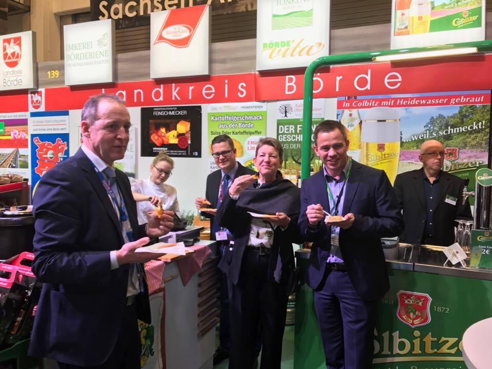 In der Sachsen-Anhalt-Halle nahnm sie zusammen mit dem Geschäftsführer der Agrarmarketinggesellschaft Sachsen-Anhalt Dr. Jörg Bühnemann einen Imbiss ein. Es gab frisch von Michael Rätz zubereitete Sülze-Taler-Kartoffelpuffer aus Kartoffeln aus der Börde, wie auch die Volksstimme (24.01.2017) berichtete.