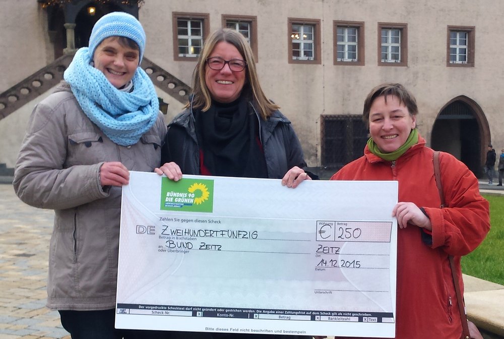 Prof. Dr. Claudia Dalbert übergab einen Schecks in Höhe von 250 Euro an den BUND Zeitz. Mit 250 Euro unterstützt der Aktionsfonds aller BÜNDNISGRÜNEN Landtagsabgeordneten den BUND Zeitz, der eine Konferenz über nachhaltigen Umweltschutz organisiert hat.