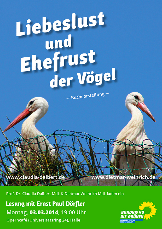 Vögel flirten im Morgengrauen, manche erst nach Mitternacht. Manche halten viel von einer dauerhaften Bindung und familiärem Zusammenhalt, selbst im Herbst und Winter, andere stehen mehr auf Verlobung, auf Saisonehe oder auf freier Liebe. Die Beziehungen zwischen Männchen und Weibchen sind Thema des Buches „Liebeslust und Ehefrust der Vögel“ von dem Zerbster Ökologen und Publizisten Ernst Paul Dörfler, der 2010 auf Grund seines langjährigen Umweltengagements mit dem renomierten EuroNaturpreis ausgezeichnet wurde.