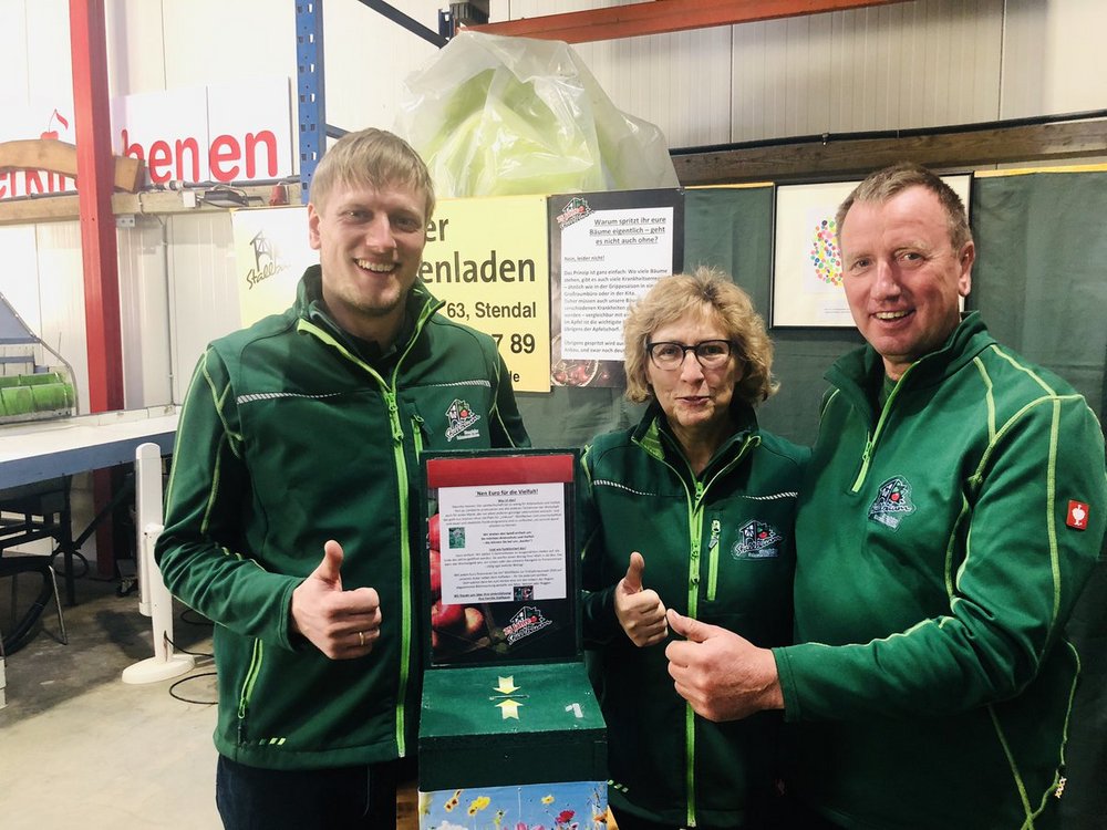 Zum Projektstart von "Nen Euro für die Vielfalt" wirft Claudia Dalbert, die die Schirmherrschaft des Projekts übernommen hat, ein Zwei-Euro-Stück in die Sammelbox. Der Initiator des Projekts ist André Stallbaum, der Junior-Chef eines landwirtschaftlichen Familienunternehmens in Stendal. Für jeden Euro soll eine fünf Quadratmeter große Blühwiese zur Frühjahrsaussaat 2020 auf dem Acker neben dem Hofladen der Stallbaums entstehen.