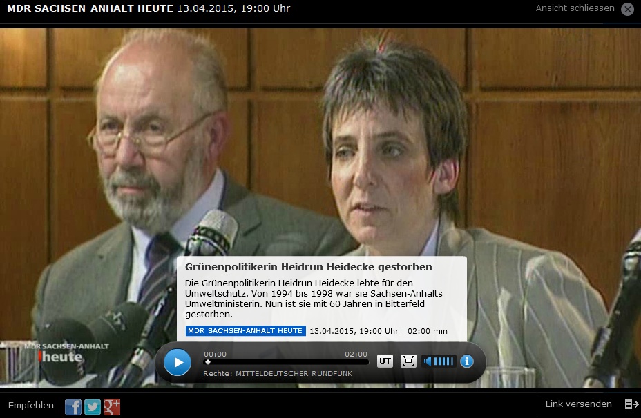 Die Grünenpolitikerin Heidrun Heidecke ist plötzlich verstorben. Claudia Dalbert beschreibt in ihrem Statement bei "MDR Sachsen-Anhalt heute" die hohen Verdienste der ehemaligen Umweltministerin.
