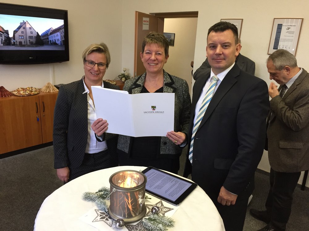 Umweltministerin Prof. Dr. Claudia Dalbert hat am Montag, 19. Dezember 2016 zusammen mit Finanzminister André Schröder einen Zuwendungsbescheid in Höhe von rund 1,6 Mio. Euro an den Wasserverband Südharz in Sangerhausen übergeben. Damit unterstützt das Land den Bau der Anschlussleitung an das Fernwasserversorgungssystem weiter. Zuvor reichte es schon für die vorbereitenden Arbeiten Fördermittel in Höhe von ca. 1,5 Mio. Euro aus.
