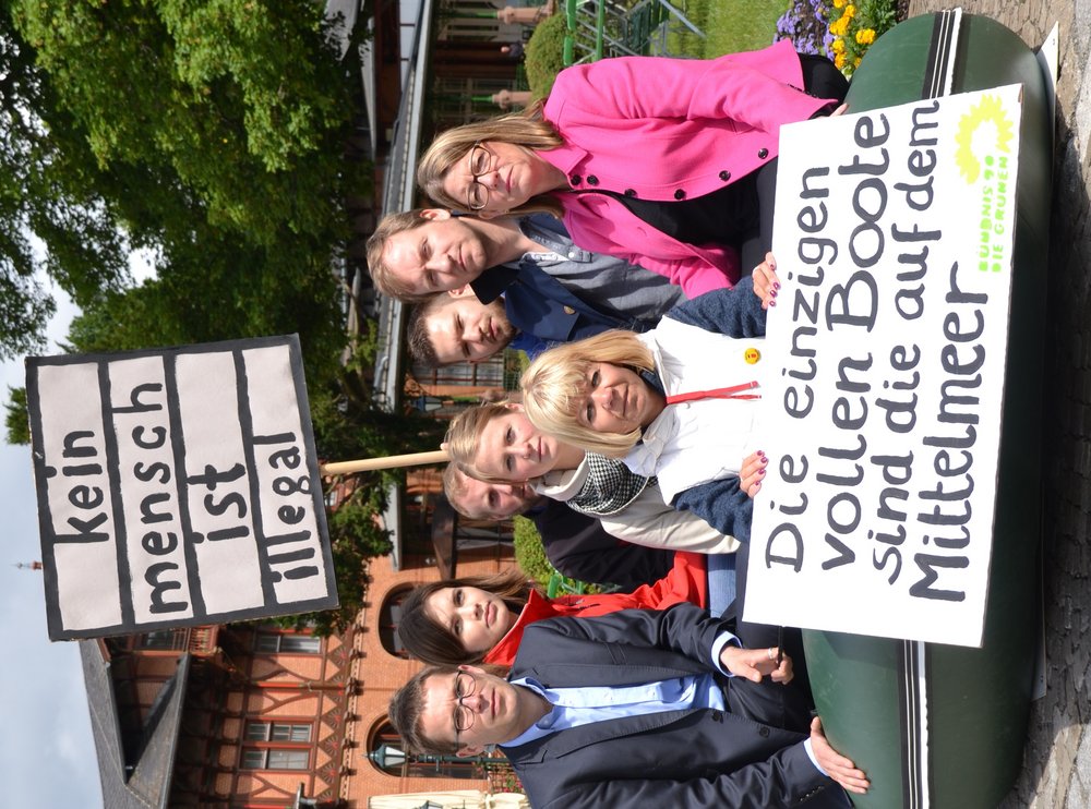 Anlässlich des Besuchs von Bundesinnenminister Thomas de Maizière drängten sich Mitglieder des Landesvorstandes und Mitglieder der Fraktion BÜNDNIS 90/DIE GRÜNEN im Landtag von Sachsen-Anhalt in ein kleines Schlauchboot, um darauf aufmerksam zu machen, dass die einzigen vollen Boote, die Flüchtlingsboote auf dem Mittelmeer sind.