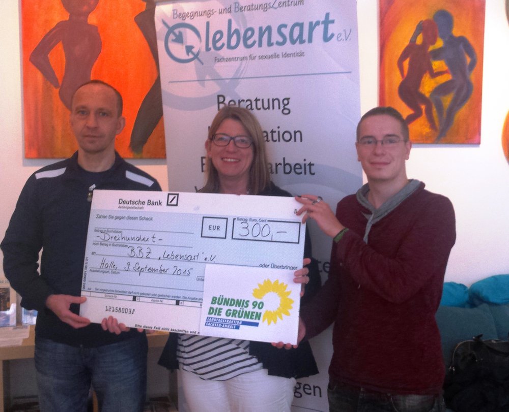 Die Fraktionsvorsitzende der BÜNDNISGRÜNEN Landtagsfraktion, Prof. Dr. Claudia Dalbert, hat einen Scheck in Höhe von 300 Euro an die Mit-Organisatoren des CSD, der Verein BBZ "Lebensart"e.V., übergeben. Den Scheck nahmen stellvertretend für das BBZ "Lebensart" e. V. , das gemeinsam mit der Deutschen Aidshilfe den CSD auf die Beine stellt, das Vorstandsmitglied Stefan Fiebig und der Mitarbeiter Ants Kiel in Empfang.