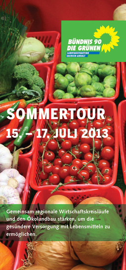 Heute in einer Woche startet die Sommertour der Fraktion von BÜNDNIS 90/DIE GRÜNEN. An drei Tagen (15. bis 17. Juli) sind dann drei Teams mit jeweils drei Abgeordneten in Sachsen-Anhalt unterwegs. "Mit unserer Sommertour starten wir nach 2011 und 2012 zum dritten Mal. Diesmal ist Ernährung das Thema unserer Tour. Unser Motto lautet: "Regional, Bio, Lecker", sagt die Fraktionsvorsitzende von BÜNDNIS 90/DIE GRÜNEN, Dr. Claudia Dalbert.