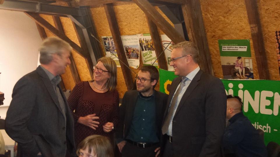 Claudia Dalbert im Gespräch mit Herrn Landrat Götz Ulrich, Fraktionskollege Sebastian Striegel und Landtagskollege Harry Lienau auf dem Neujahrsempfang vom Kreisverband Burgenlandkreis.